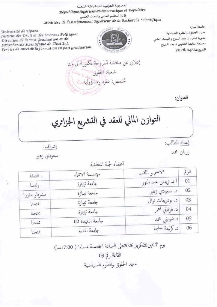 الاطروحة بعنوان التوازن المالي للعقد في التشريع الجزائري